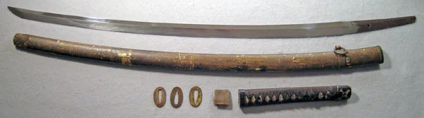 Mountings: Handachi mounts that were converted for use in the second world war. Beautiful matching kabutogane, fuchi and koiguchi, done in shakudo with gold outline and a carved, floral design in the shakudo. Nice floral shakudo menuki, 3 copper seppa but the tsuba is missing. The ishizuke and shibabiki are also missing from the saya. The handle wrap is in good condition over high quality same. The lacquer on the saya is damaged and the krurikata was broken off and replaced with a military ashi. There is also wood missing from the saya. This would be a truly beautiful set of mounts with a matching shakudo tsuba (have a look at 504tsuba3 in our fittings section) and a newly made saya, using the koi-guchi from this one.